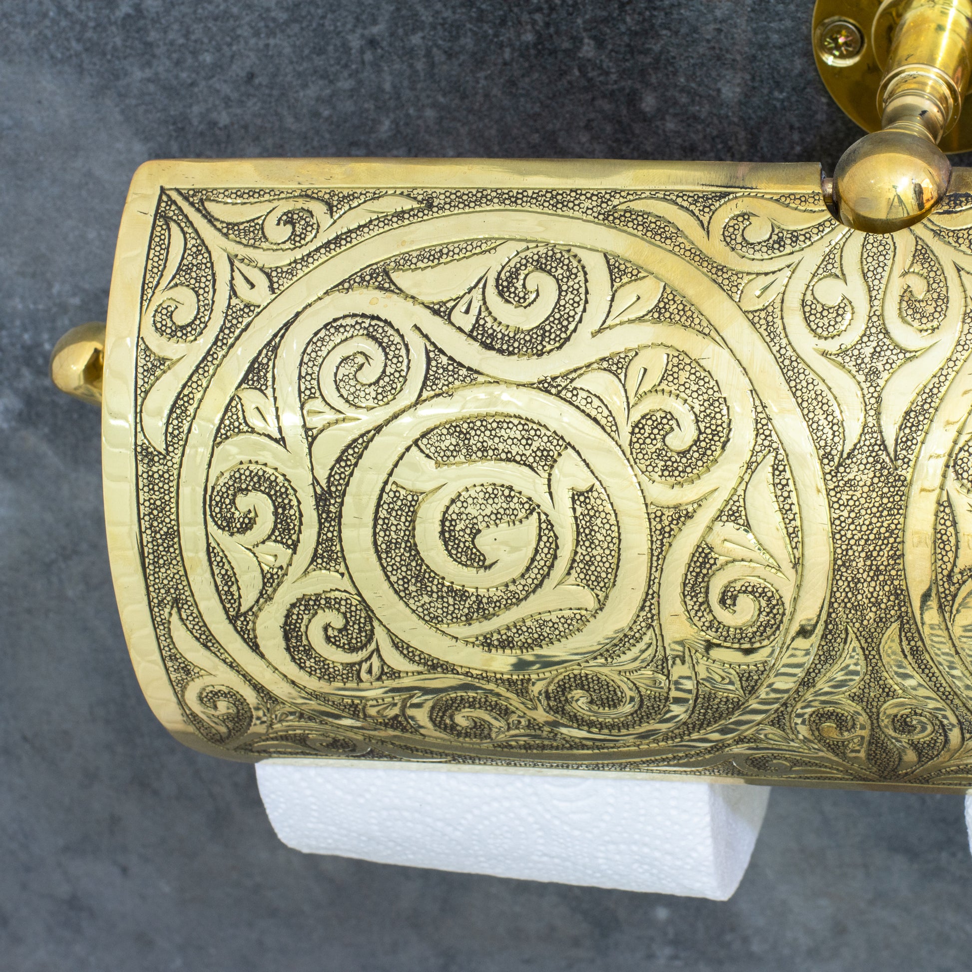 Handcrafted Unlacquered Brass Double Toilet Paper Holder | Engraved Sliding Cover